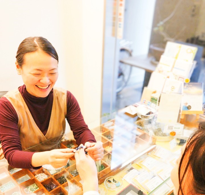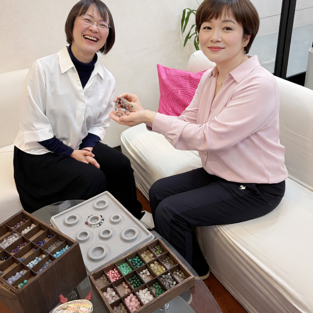 以前、ご来店いただいた方が2人組のペアでした。作成のプロセスを楽しみながら進めていたのですが、一方の人が時折、気まずそうなお顔をふとされることが気になっていたので、お連れ様が席を外した時に「何か気になることがありますか」と尋ねると、「友達がいる前では言えなかったんだけど…」と本音をお話しされ、その日はゆっくり観ることができないので後日一人で来店してもらいました。時間を使ってしっかりお悩みに沿ったパワーストーンブレスレットの作成をし、継続的に瞑想も行いました。そうすると人が変わったように明るくなり、お声にも張りが出てきて「小学校以来こんなに毎日ワクワクしたことがない。ここに出会ってよかった。」と言っていただきました。このことがあって以来、同伴が必ず必要だという方以外はプライベートセッションとしてお越しいただいています。当店は折角お越し頂くのであればセッションが深い気づきになり、パワーストーンブレスレットを通して自己実現、成長を感じていただきたいと願っています。